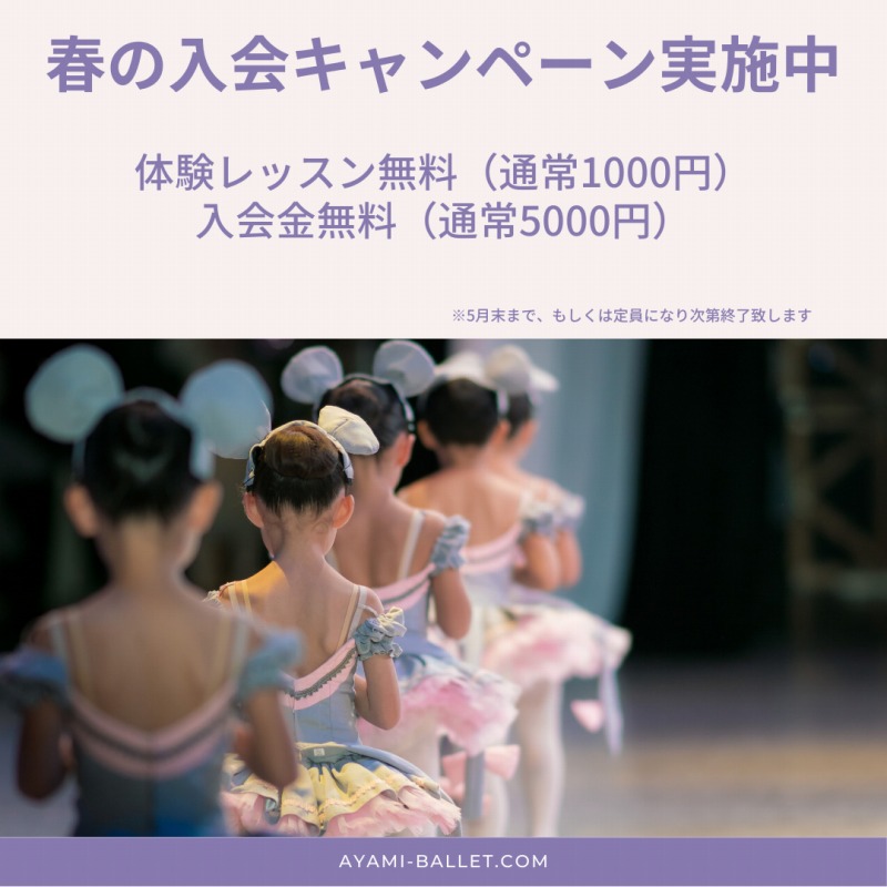 AYAMI BALLET STUDIO では4月より春の入会キャンペーンを実施しております。 体験レッスン無料(通常1000円)入会金無料(通常5000円)となります。5月末まで、もしくは定員になり次第終了となりますので、この機会にご検討ください。定員のクラスもござ...