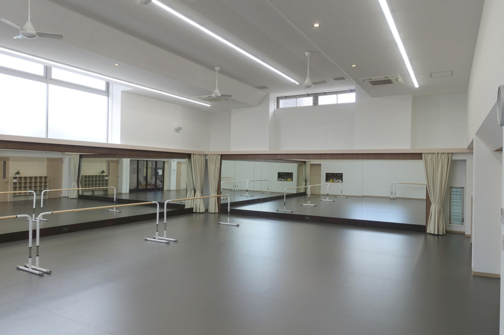 開放感のある高い天井と、バレエ専用のリノリウム床となっております。ダンサーの足に優しいクッションフロアとなっておりますので、体への負担を最小限に留めることができます。